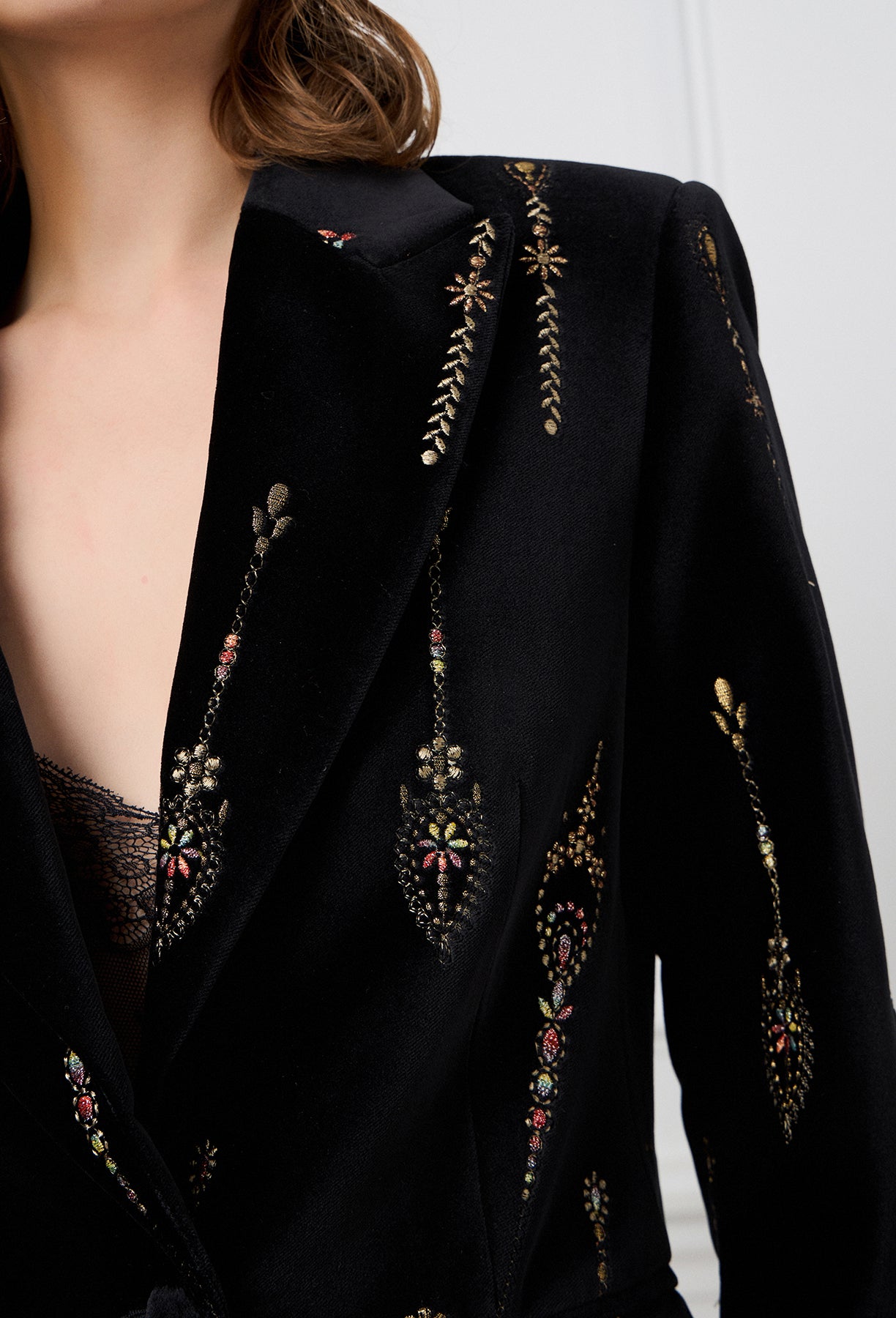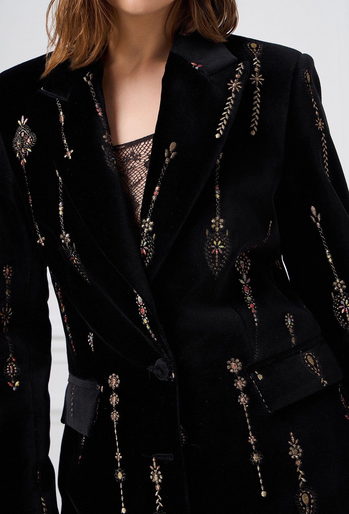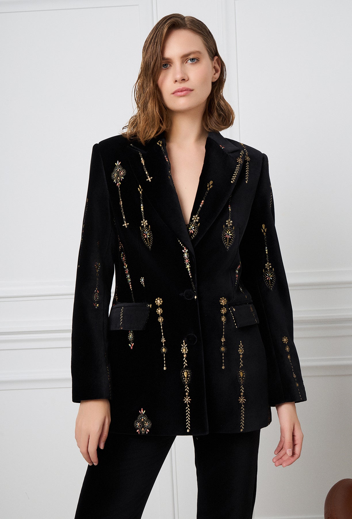 Where jewelry meets fashion. This exclusive collaboration brings Antonia Karra’s iconic evil eye to a statement jacket—turning a best-selling jewel into wearable art. Hand-painted & hand-embroidered, and undeniably powerful, it’s a piece that protects and stuns all at once.