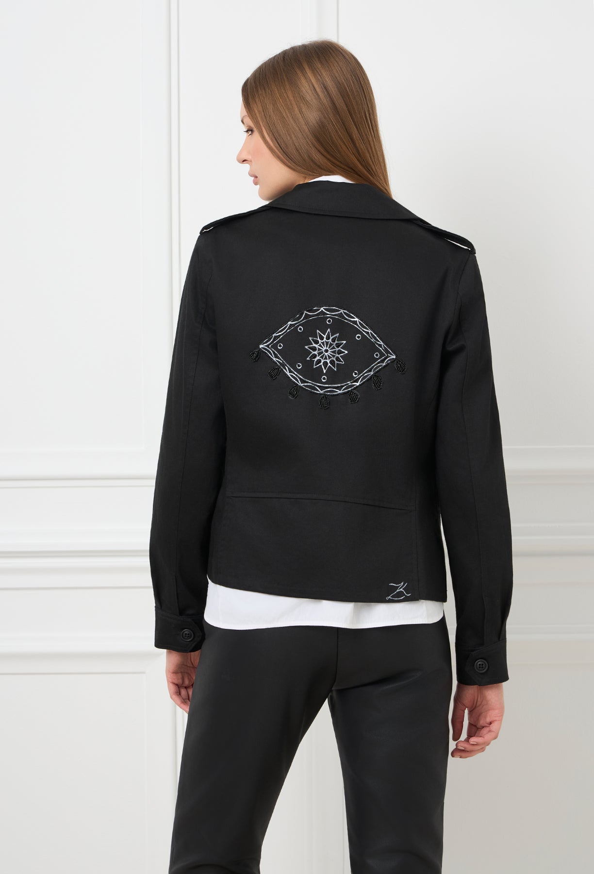 Where jewelry meets fashion. This exclusive collaboration brings Antonia Karra’s iconic evil eye to a statement jacket—turning a best-selling jewel into wearable art. Hand-painted & hand-embroidered, and undeniably powerful, it’s a piece that protects and stuns all at once.