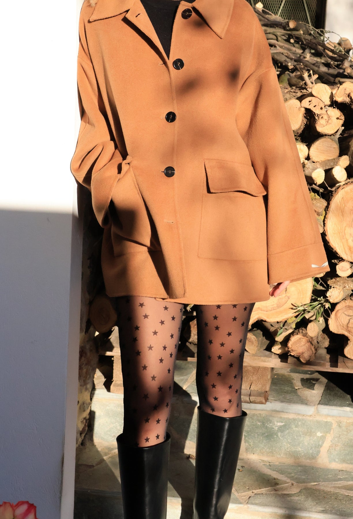 Wrap yourself in timeless elegance with this sophisticated cape, featuring a super delicate embroidery across the back. The statement front pockets add a modern edge, making it as practical as it is luxurious. Perfect for transitioning from day to night, this cape is crafted for those who seek refinement with a touch of artistry.